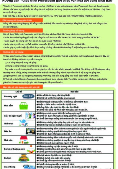 “Giáo trình Powerpoint giới thiệu đời sống văn hoá Nhật Bản” là giáo trình giảng dạy bằng Powerpoint, được sử dụng trong các