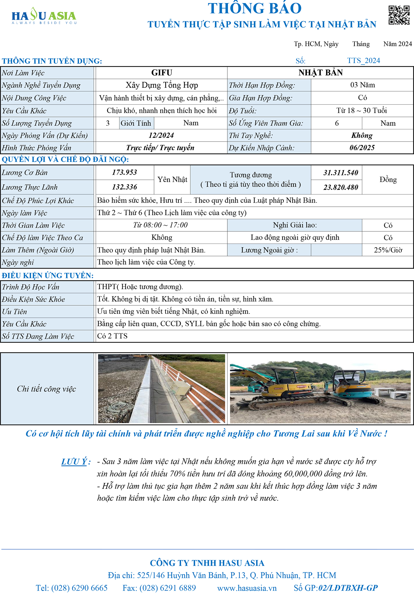 Công ty TNHH HASU ASIA hiện đang tuyển dụng thực tập sinh làm việc tại Nhật Bản, ngành nghề xây dựng tổng hợp với các thông tin chi tiết sau: